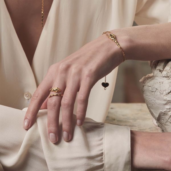 Il bracciale “Ritornando Nero” è un’elegante creazione in argento 925 placcato oro ad alto spessore, con una finitura nera che conferisce un tocco di mistero e raffinatezza. Il design presenta una testa di serpente con striature nere al centro, simbolo di forza e saggezza. La lunghezza del bracciale è regolabile fino a un massimo di 18 cm grazie a una piccola sfera scorrevole, garantendo una perfetta vestibilità per ogni polso. All’estremità si distingue il cuore Maman traforato, aggiungendo un tocco romantico e distintivo al gioiello. La chiusura a moschettone assicura una facile apertura e chiusura in tutta sicurezza. Questo bracciale fa parte della collezione “Ritornando”, realizzata con maestria artigianale in Italia. Aggiungi un tocco di stile e personalità al tuo look con questo esclusivo bracciale dalla collezione “Battito”.