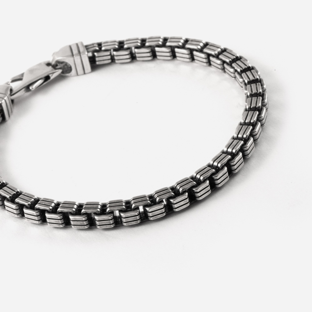 Il bracciale VENEZIANA RIGATA crea con i suoi cubi rigati un metraggio che alterna spazi pieni e vuoti e che genera una trama morbida e sagomata.