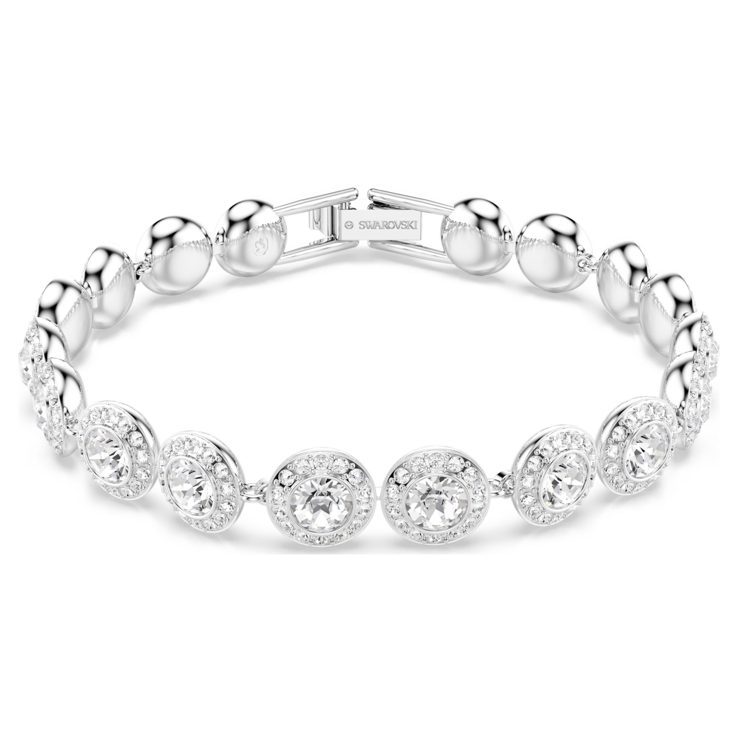 Avvolgi il tuo polso di luce con questo luminoso bracciale Una Angelic. Il design, placcato rodio, presenta singole maglie nel centro di ognuna delle quali è incastonato un brillante cristallo incorniciato da un alone di cristalli più piccoli di taglio Round. Una scelta di eterea eleganza, perfetta da abbinare a gioielli coordinati della stessa famiglia.