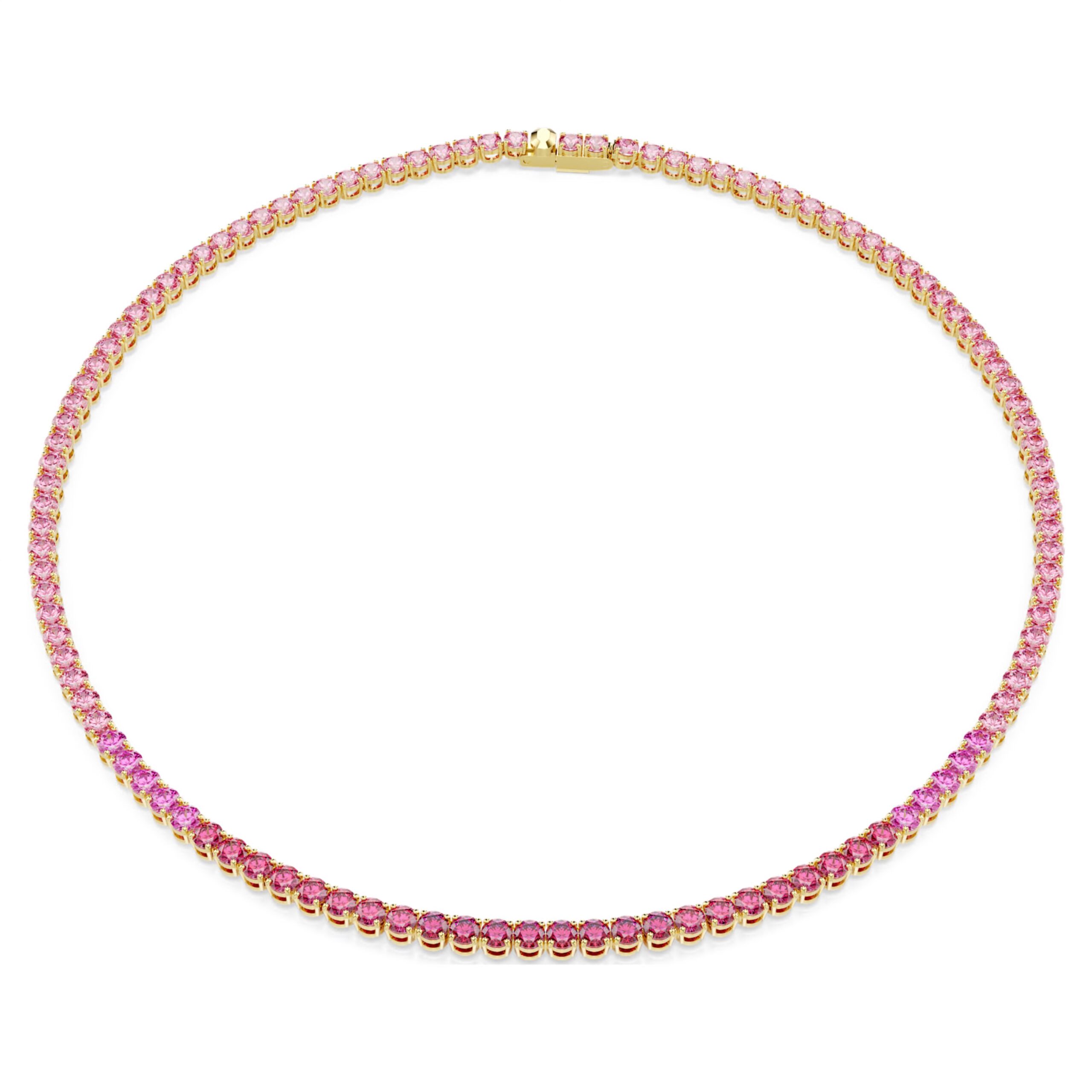 on la sua vivace tonalità rosa, la collana è stata creata per incantare. Il design presenta un filo completo di cristalli taglio Round, tutti incastonati in una montatura placcata in tonalità oro che include una chiusura sicura e raffinata. L’effetto complessivo è di una bellezza rasserenante, che ti permette di sprigionare il tuo fascino, sia di giorno che di sera.