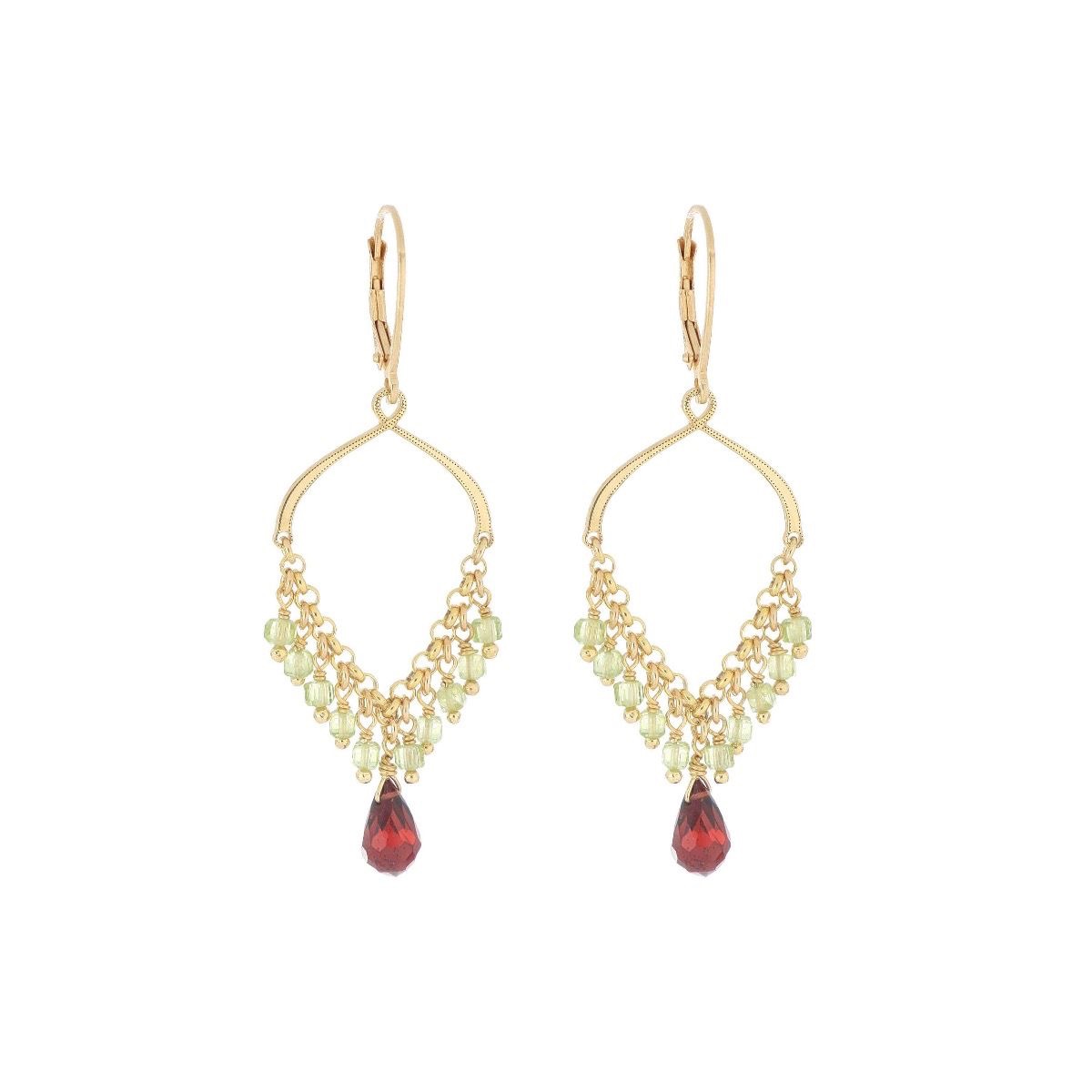 Coppia di orecchini a monachella con pietre di peridoto e goccia di granato.
