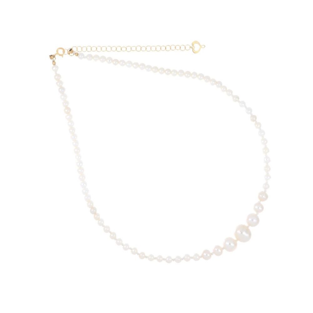 Girocollo in oro giallo 18 carati con perle bianche in diverse dimensioni.