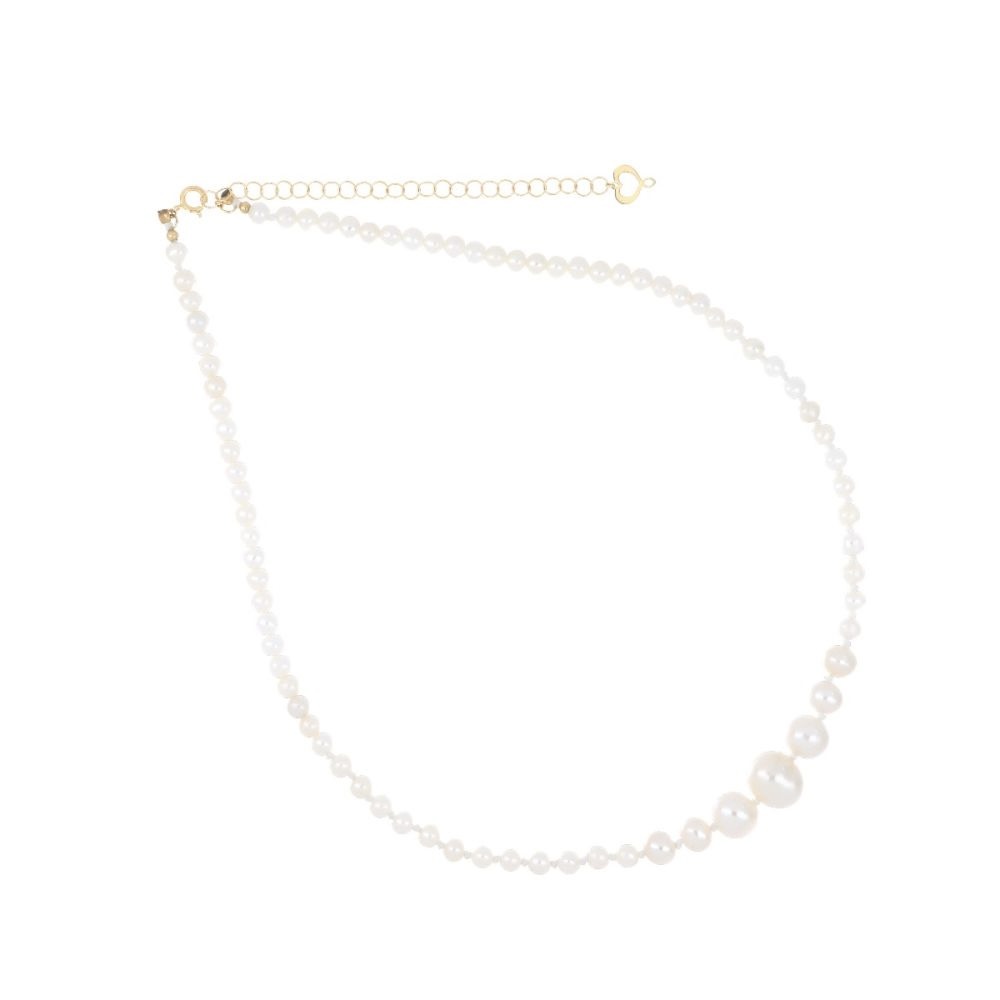 Girocollo in oro giallo 18 carati con perle bianche in diverse dimensioni.