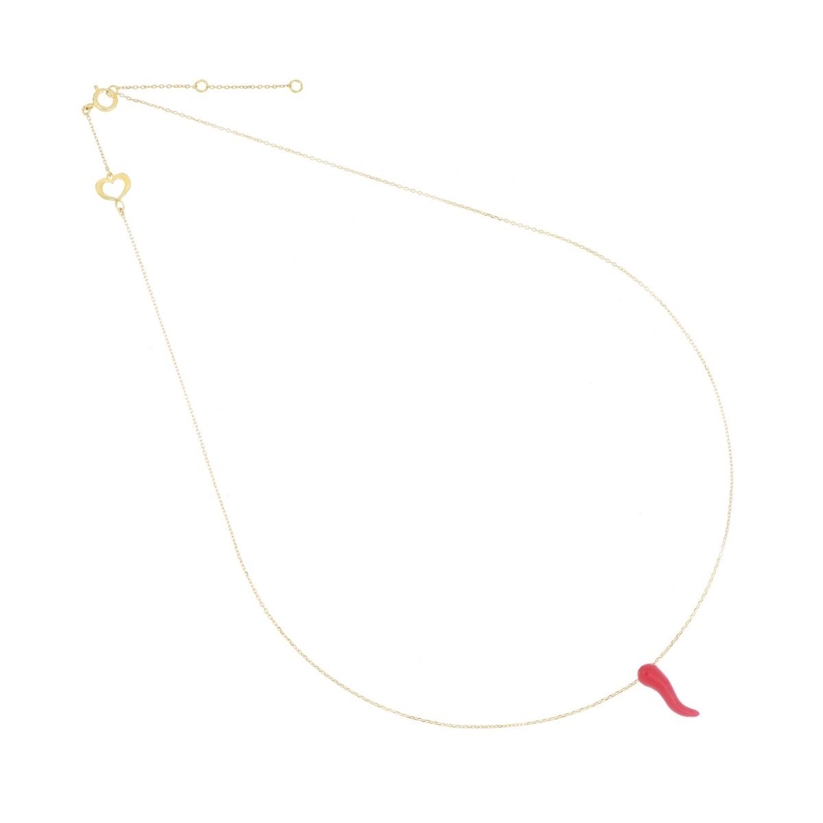 Girocollo in oro giallo 18 carati con un cornetto passante in smalto rosso.