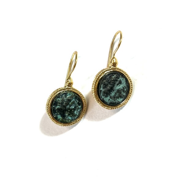 Orecchino a monachella in argento 925/°° placcato oro 18 kt con monete in bronzo anticate.
